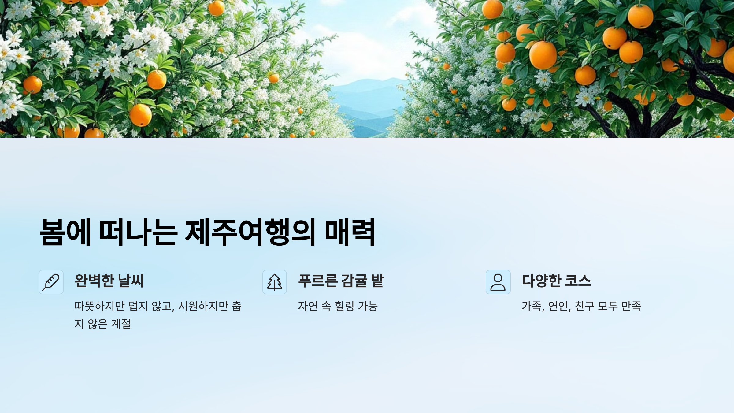 5월의 제주는 누구나 사랑에 빠질 수밖에 없는 계절이에요. 따뜻하지만 덥지 않고, 시원하지만 춥지 않은 그야말로 ‘완벽한 날씨’🌿! 저는 이맘때의 제주를 가장 좋아하는데요, 푸르른 감귤 밭 사이를 걷다보면 자연스럽게 힐링이 되더라고요. 특히 가족, 연인, 친구끼리 모두 만족할 수 있는 코스가 많아 선택의 폭도 넓답니다.